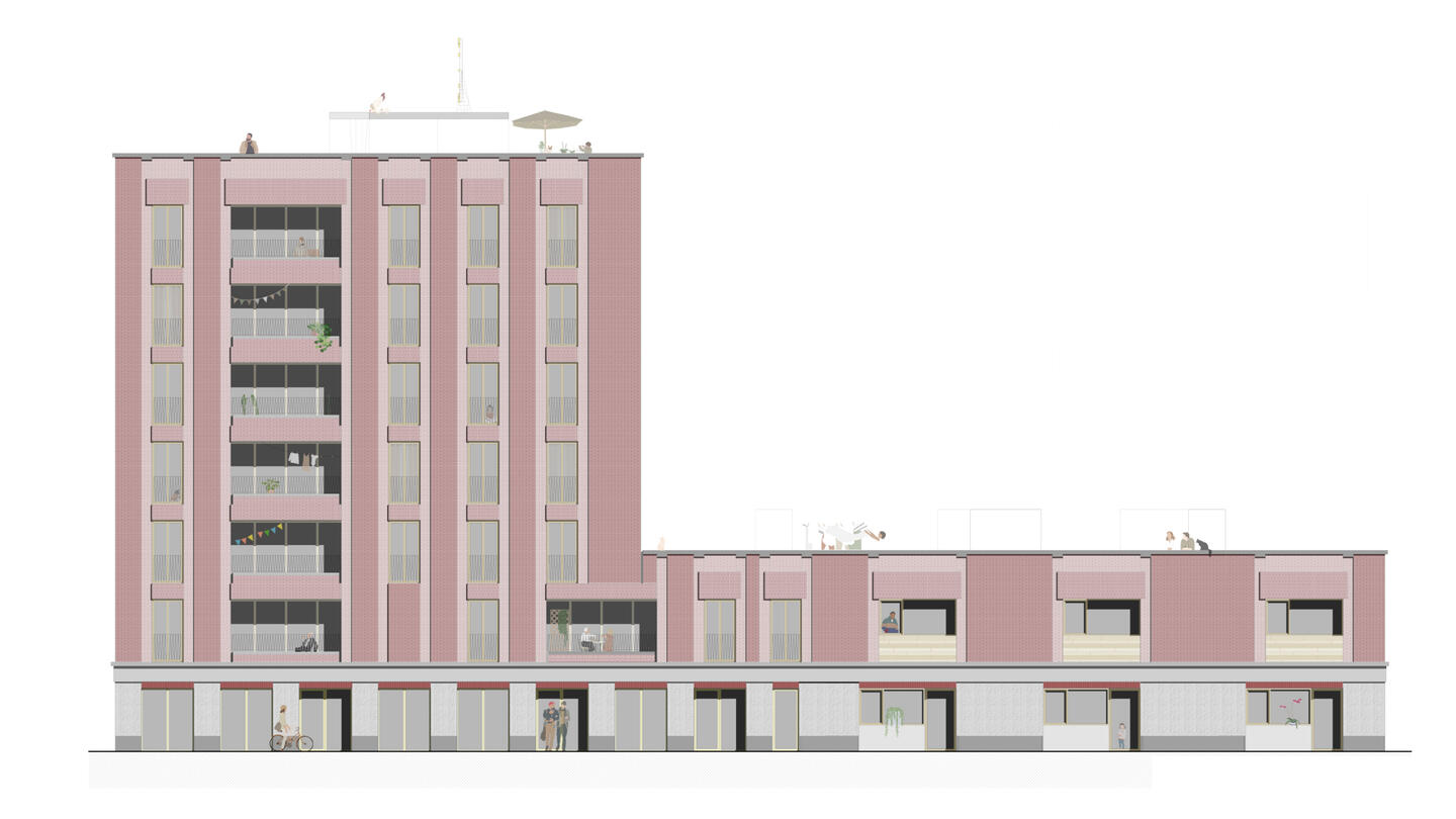 L'edificio che ho progettato si affaccia al piano terra con, sul lato della strada alcune attività commerciali, mentre sul lato prospicente al parco alcune maisonettes.