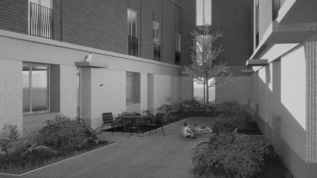 Ho previsto l'accesso alle maisonettes tramite una corte interna con delle zone verdi e pavimentate.