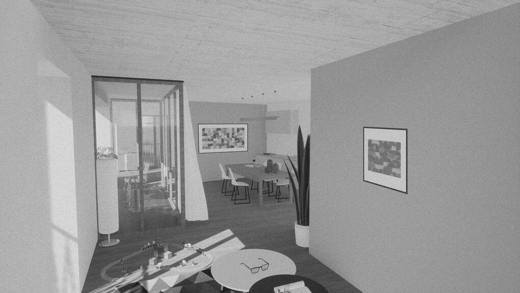 Infine le immagini atmosferiche permettono una comprensione delle materialicità della corte e di uno degli appartamenti piu grandi.