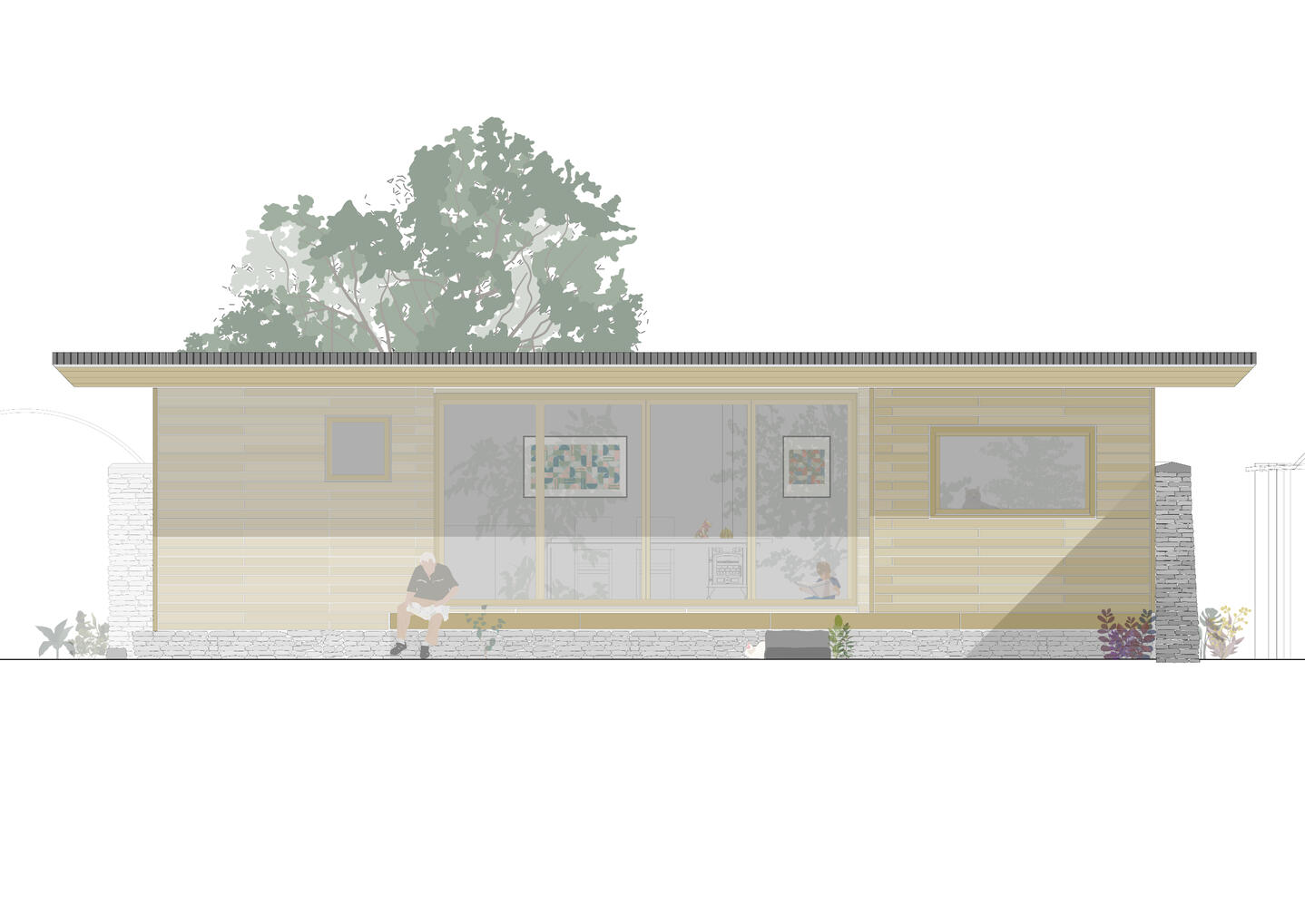 La genesi del progetto si concepisce da una muratura in pietra a L, ribaltata, al cui interno una "scatola" in legno viene adagiata. Gli spazi prima citati suddividono questa scatola.